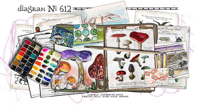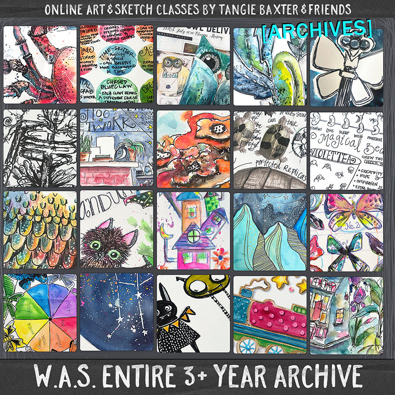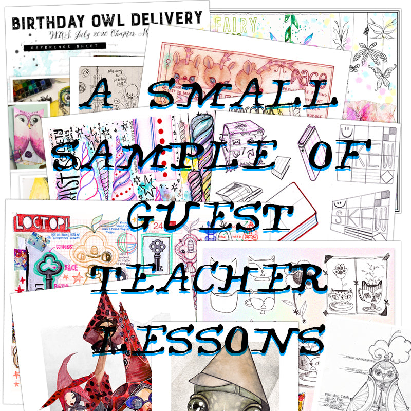 - 44 Three-hour Video Art Parties, with watercolor alchemy experiments, drawing lessons, prompts, brainstorming ideas, storytelling encouragement, and more (such as a few mixed-media projects and making zines). Includes over a dozen guest lessons from James Burke.